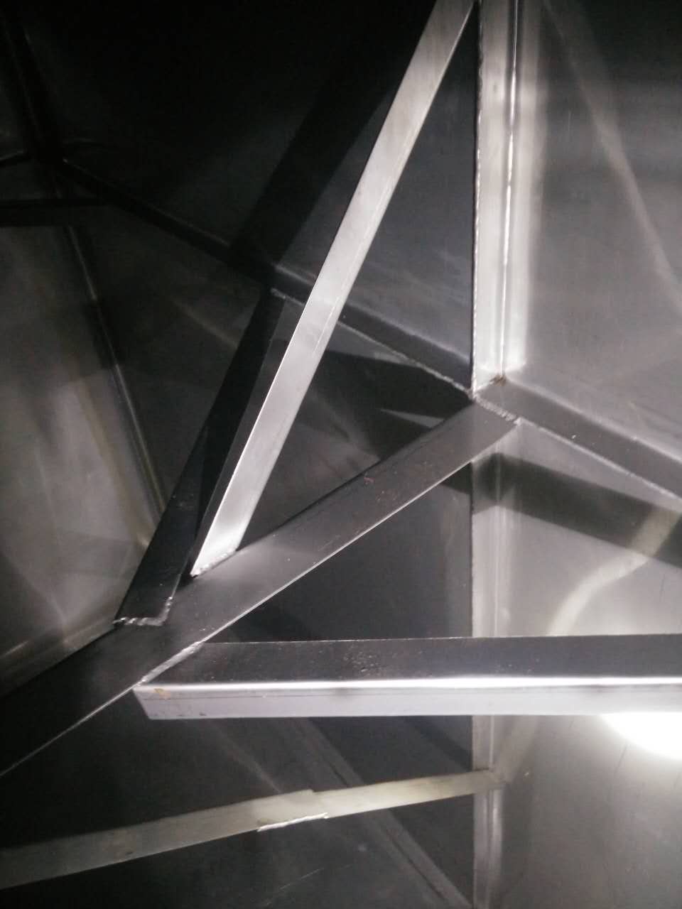 主拉主要作用是防止水箱變形,厚度一般采用靠近底板的側板厚度為基準,規格為4cm*4cm。其焊接間距一般為1000mm一條,大型水箱特別是高度超過3米以上的。其間距應該為500mm一條,連接處必須進行滿焊處理。