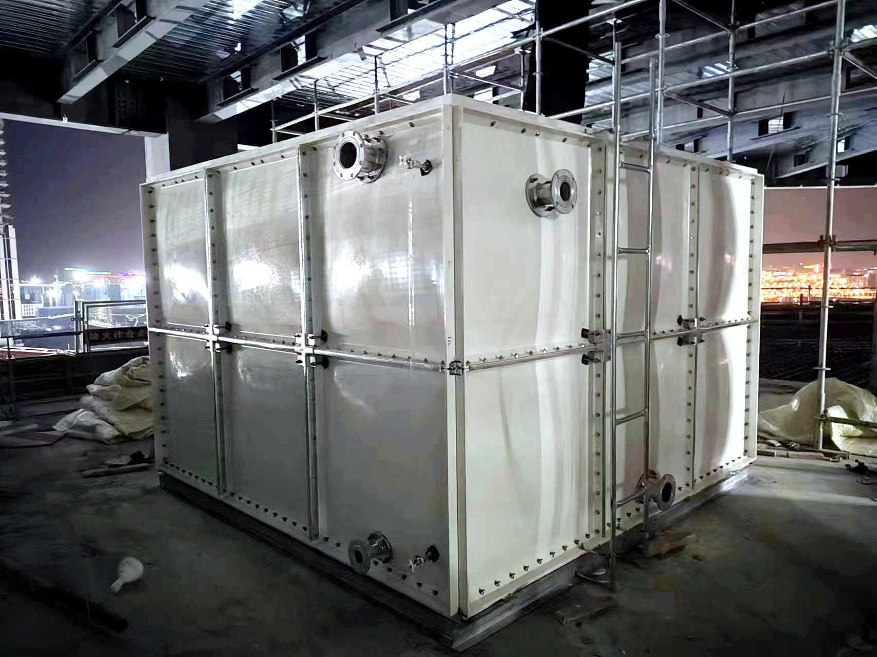 我司承接的河北省保定市雄安新區中化集團現代化辦公樓消防臨時水箱項目,已安裝試水完畢。玻璃鋼水箱整體由好的SMC水箱板拼裝而成,造價低。其特點是采用樹脂,因此水質好,清潔;具有強度高,重量輕,耐腐蝕,外型美觀,使用壽命長,保養管理方便等特點。